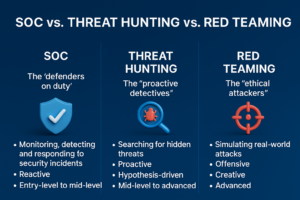 In an era where cyberattacks make headlines daily from massive data breaches at corporations to state-sponsored espionage the demand for cybersecurity professionals has skyrocketed. But not all roles are created equal. While traditional security jobs focus on reactive measures like patching vulnerabilities after an incident, there’s a surging interest in proactive roles that anticipate and outmaneuver threats. These positions empower experts to stay one step ahead of adversaries, turning defense into an active pursuit. Enter the Security Operations Center (SOC), threat hunting, and red teaming—three interconnected yet distinct paths in cybersecurity.